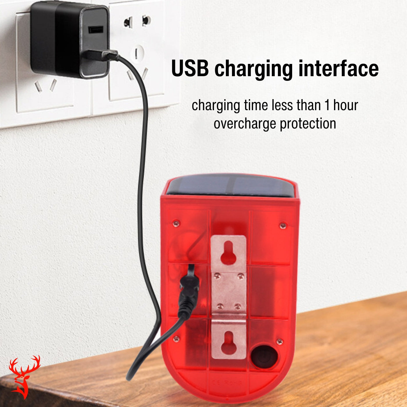The alarm features a rechargeable battery, offering two convenient charging options: solar for sunny days and USB for cloudy or rainy weather. Solar charging takes 6-8 hours, while USB charging is completed in less than an hour.