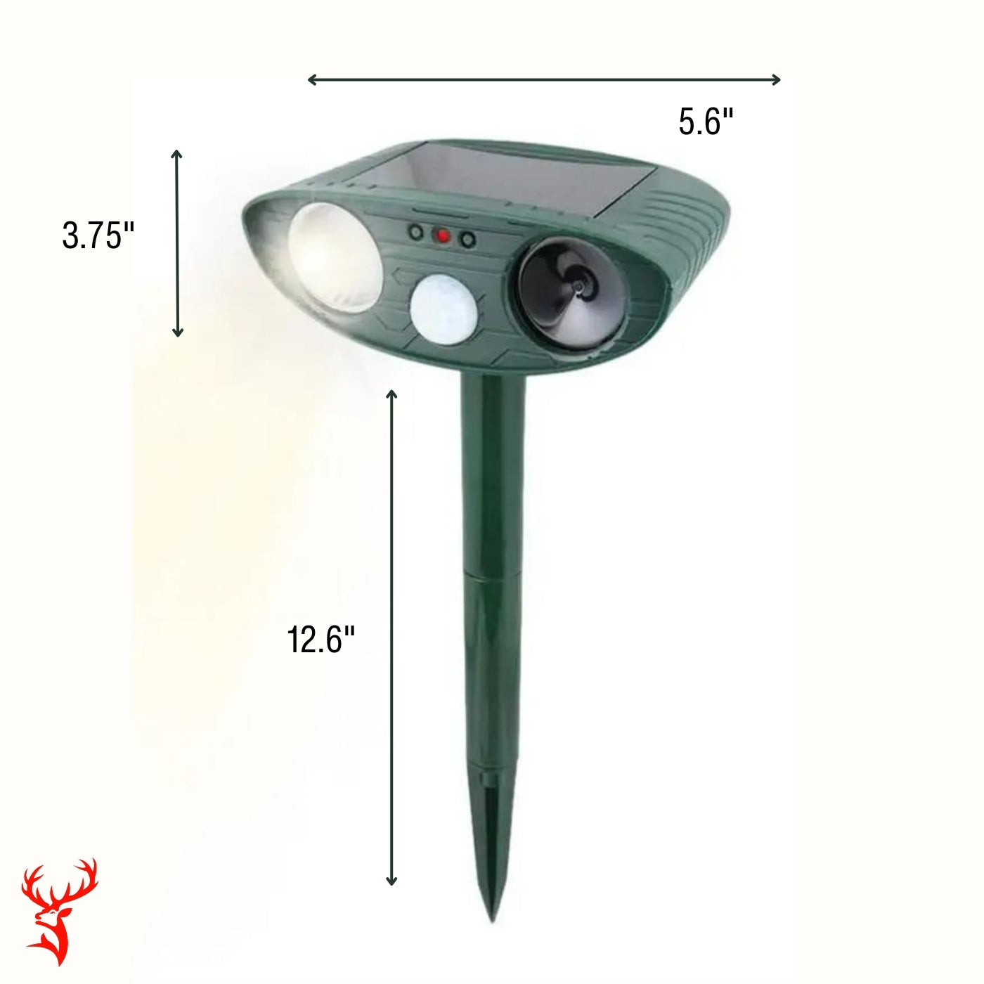 Dimensions: 5.6" x 5" x 3.75" (unit), 12.6" stake height for secure installation.